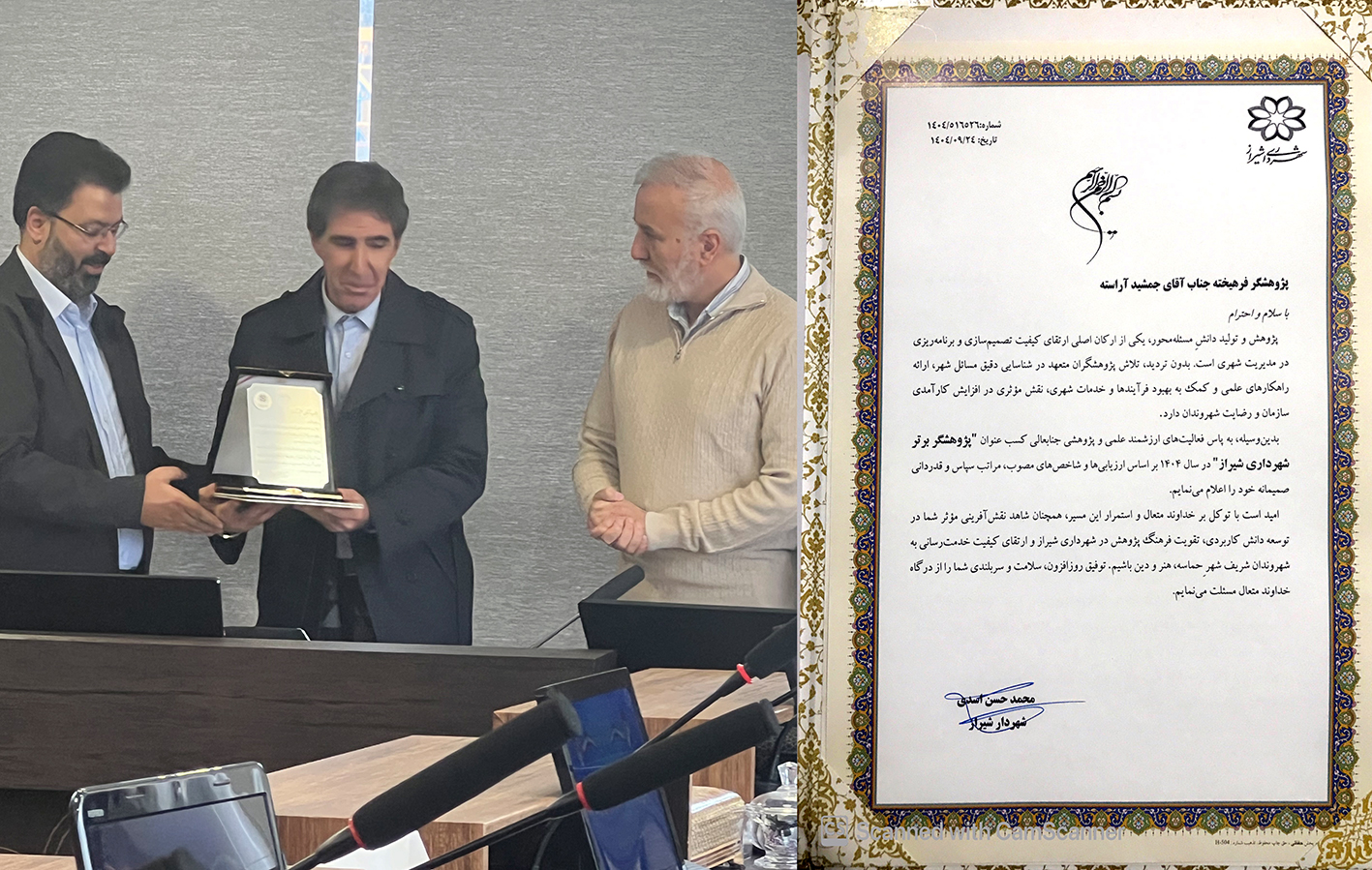 ما نیز به پاس موفقیت و کسب عنوان پژوهشگر برتر شهرداری شیراز در سال یکهزار و چهارصد و چهار خورشیدی، ارادت و پایداری خود را به شمای ارزنده تقدیم می داریم.